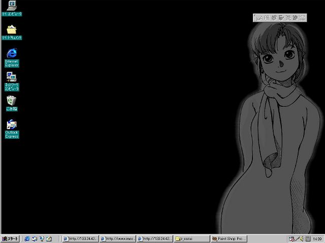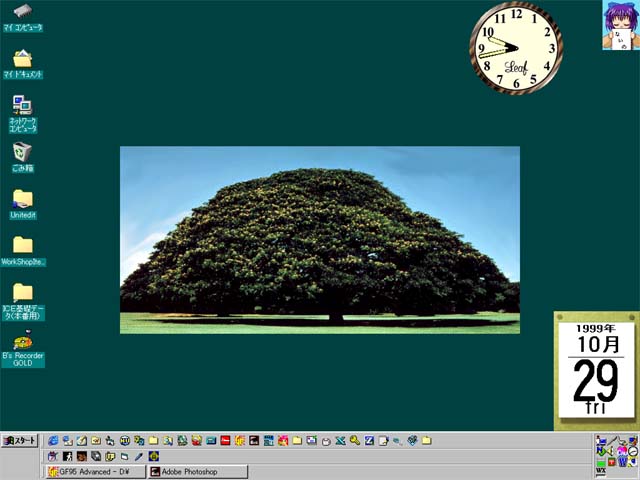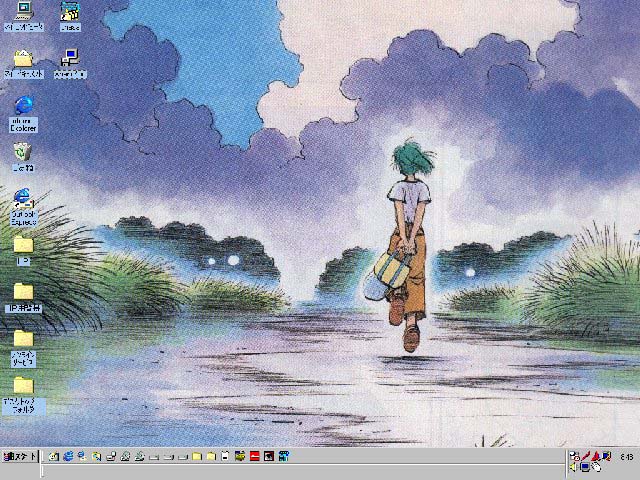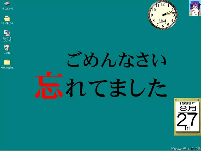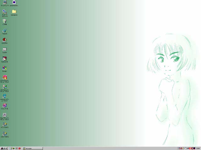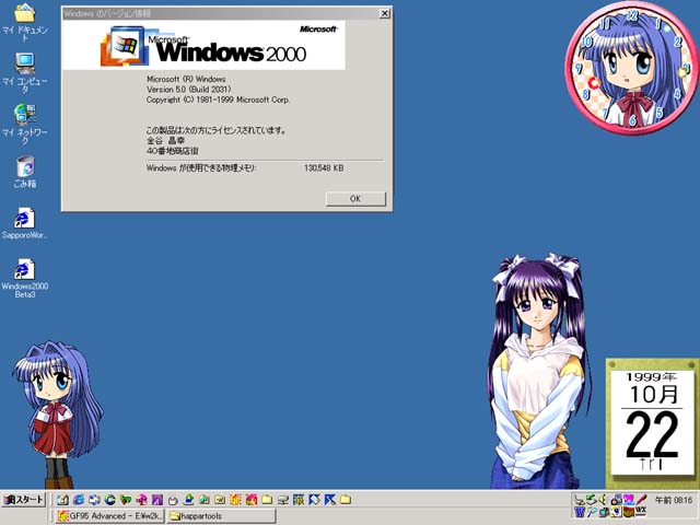 Holmes金谷 | ノートPCにインストールした、windows2000β3 サーバーのデスクトップです。 背景色が気に入っているので画像は特に貼り付けておりませんが、 時計と左下のキャラがポイント(笑)。 (時計と左下のキャラの出元=「こあだんぷと」さん http://www.os.xaxon.ne.jp/~haruki/) |