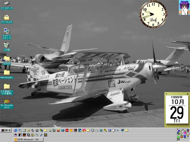 Holmes金谷 | 仕事場のパソコンの、ついこの前までのデスクトップです。 写真は自分で撮影したもので、「第21回丘珠航空ページェント」 の時に地上展示してあった、エアロックの「ピッツ S−2B」です。 元はカラーでしたけど、何となく白黒に。 (エアロック=http://www.airock.co.jp/) |