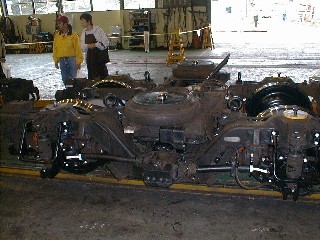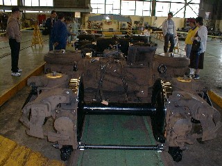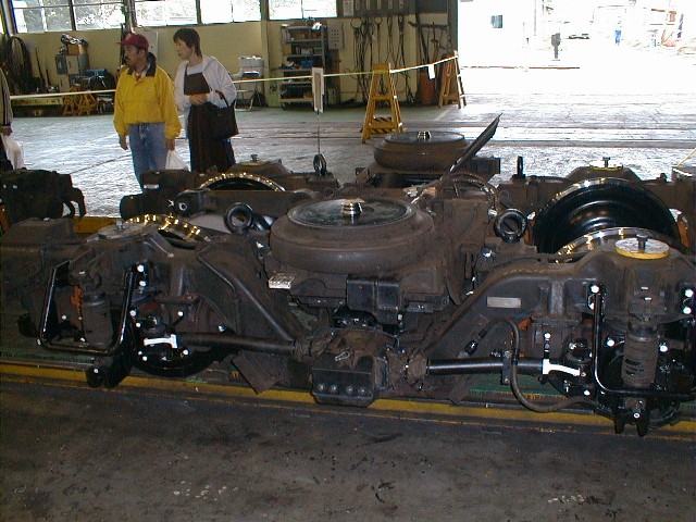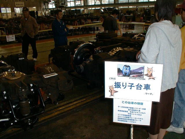 振り子式列車の台車を見掛けました。 行った時、丁度仕組みの説明をしていた所で、 「遠心力で台車の車軸を傾ける・・・まあ、舵を取るみたいな方式で・・・」 と言う説明をして居る所が聞けました。