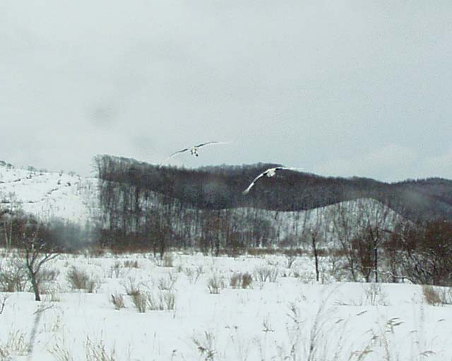 次の撮影ポイントへの移動中、車の上を丹頂のつがいがランデブー(デジカメ撮影)。