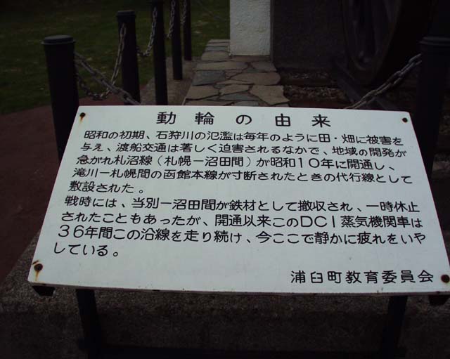 浦臼町の郷土博物館?前の広場にあった、動輪と記念碑。