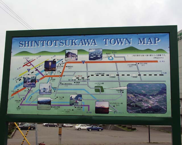 新十津川町の隣の滝川市にはグライダーの飛行場が有って、この日もセスナに牽引されて上空に舞い上がるグライダーが数多く見られました。 ふるさと公園の池で見掛けた鯉。 新十津川駅前に有るタウンマップ。